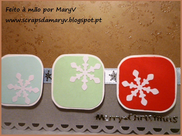 Um cartão feito com um fundo carimbado com tinta dourada e sobre o qual foram colocados flocos de neve feitos com furador. Estes flocos foram feitos com papel metalizado dourado. As tiras de cima e de baixo eram bocados de papel que estavam na minha mesa de trabalho há já algum tempo. O resultado ficou interessante.
