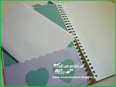 Hoje o projeto é um caderno decorado. Tinha tirado da net um molde de avental e foi com base nele que fiz a decoração deste caderno que, tal como está escrito, servirá para escrever receitas. No interior das capas da frente e de trás resolvi pôr dois bolsos. O caderno tem 80 folhas e tamanho A5.