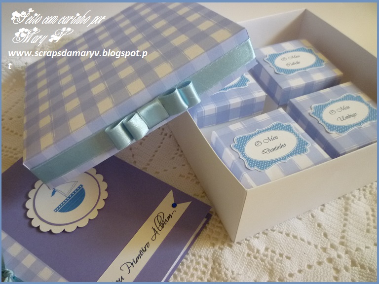 Today I thought I'd bring you a project I made for a baby. It is a box that holds small boxes for the baby's first "things" (hospital bracelet, tooth...) and an album for photos. I kept the whole project very simple as you can see. I hope you like it.