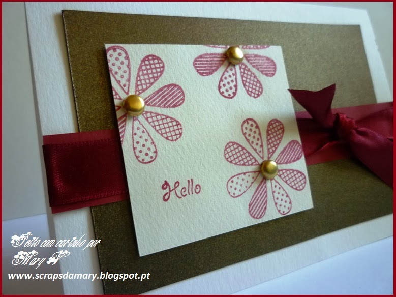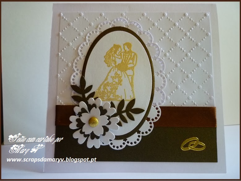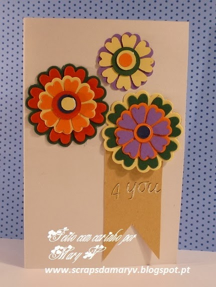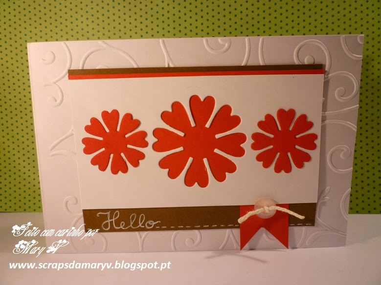 Today I'm showing another Autumn card. It's a one layer card with the standard size. I've used painter's tape to mask the part of the card I wanted to cover with ink and used a sponge to cover it with orange, yellow and a bit of bordeaux. The leaves were embossed with white opaque embossing powder. I just love the result! The thread and sequins gave it the final touch. I hope you like it and have a wonderful weekend.