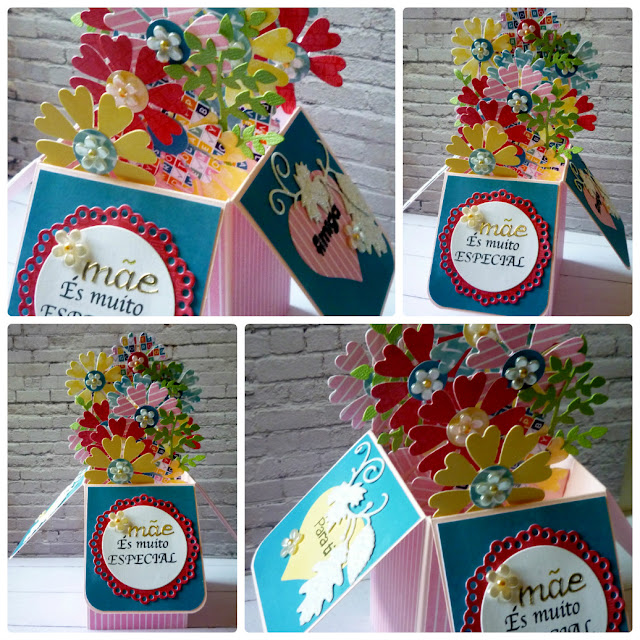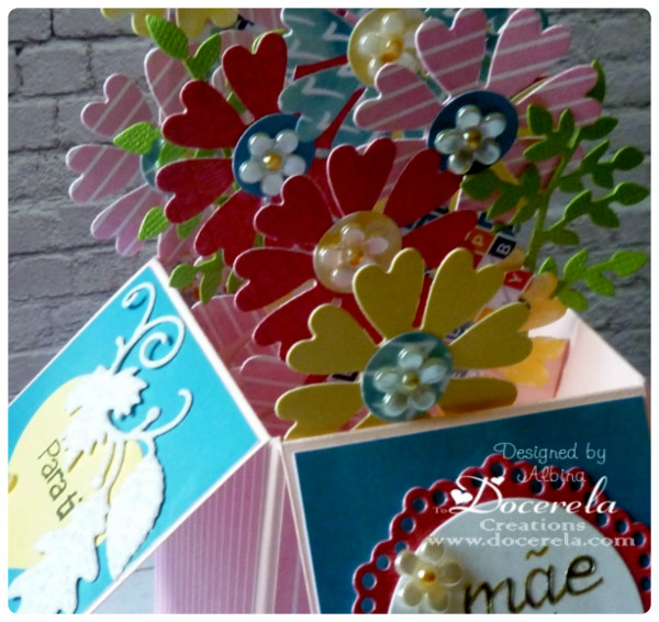To make this card I've used the template with the measures I'm leaving down the post, just in case you're interested in making it using the metric system. After cutting the base in pink cardstock, I cut and glued the decorative papers. They're cut 0,5cm shorter than the corresponding rectangle. As you can see, I rounded all corners. Then I used a Sizzix die to cut the flowers in the diffeent colours and filled the card to make a bouquet. The messages I used for this card are from Docerela. In my case, I used the Portuguese stamps, but in case you're interested, Docerela shop offers a wide variety of stamps in English, too. To finish mt card I've also used some pearl flowers and some glitter paper cut with some dies.