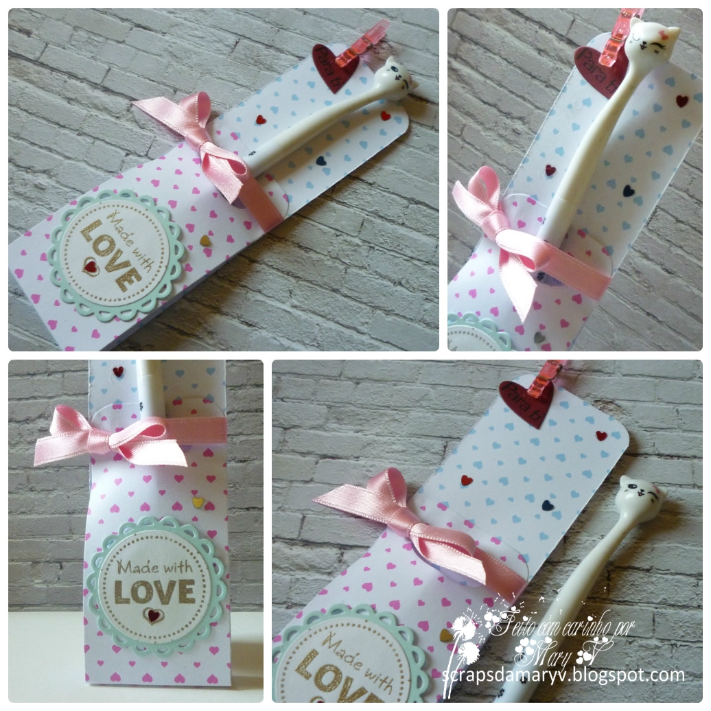 Comecei por imprimir o sentimento e depois cortei o retângulo. Nele apliquei tintas de distress em tons rosa e azul. As flores, depois de impressas, foram pintadas com lápis, recortadas e coladas no postal. Terminei com algumas meias pérolas.
