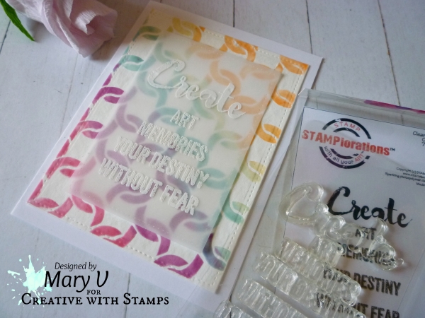 For my card, I used a stamp from Stamplorations - "Create" stamp set - and some clear Versa Fine ink onto a piece of vellum Then I applied some white embossing powder. For the background I applied embossing paste, which was coloured with distress inks, on some watercolour paper. That stencil has been in my stash forever. I thought I'd give it some love and use it more! :)