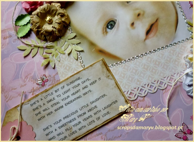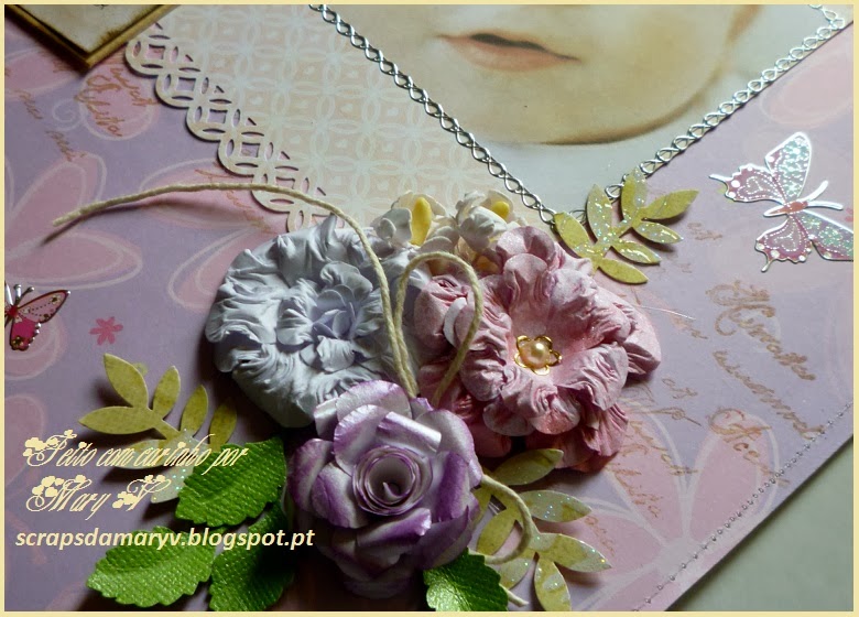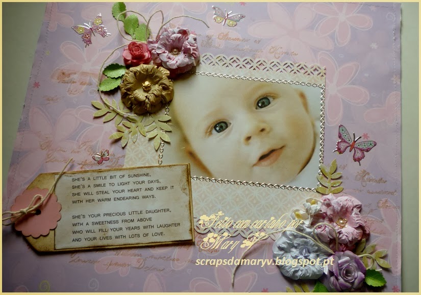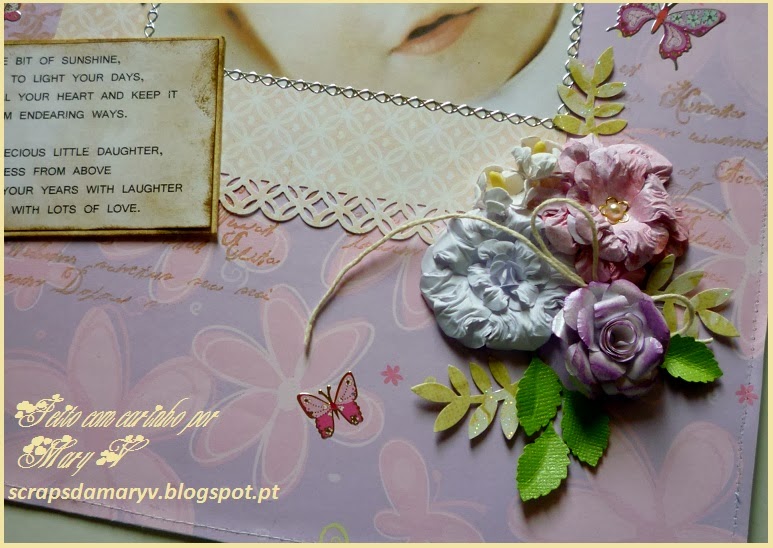 Para o realizar usei papéis da Tokie Crie e da Prima Marketing (Coleção "Delight"), um carimbo de texto, um furador Martha Stewart e outros de folhas. As flores foram feitas à mão. Para terminar, usei stickers de borboletas. Todas as princesas gostam destes bichinhos amorosos. Eis algumas fotos deste trabalho que me deu tanto prazer!