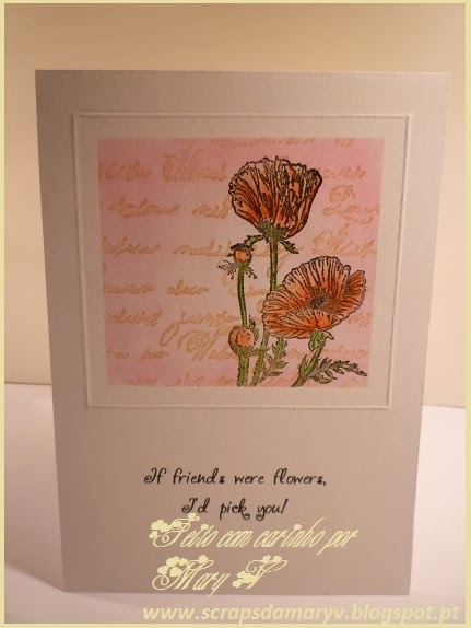 Em seguida estampei o sentimento e a flor. Para esta, usei lápis para dar alguma cor, mas sem a tornar o foco principal. Neste caso o sentimento é o mais importante, uma vez que esta semana, em Less Is More, esse deve ser o elemento principal. Usei carimbos da Docerela.