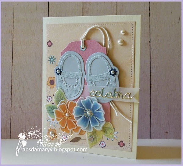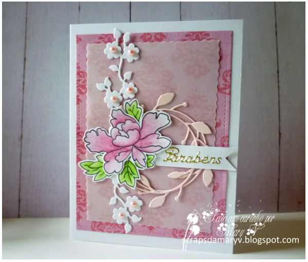 Stamprints. Usei o carimbo digital "Floral Heart", que imprimi, pintei e depois recortei em forma de coração. Para fazer a caixa, usei um molde que encontrei na Net. Para o postal, usei uma tira do mesmo papel da tampa da caixa e a mesma imagem digital.