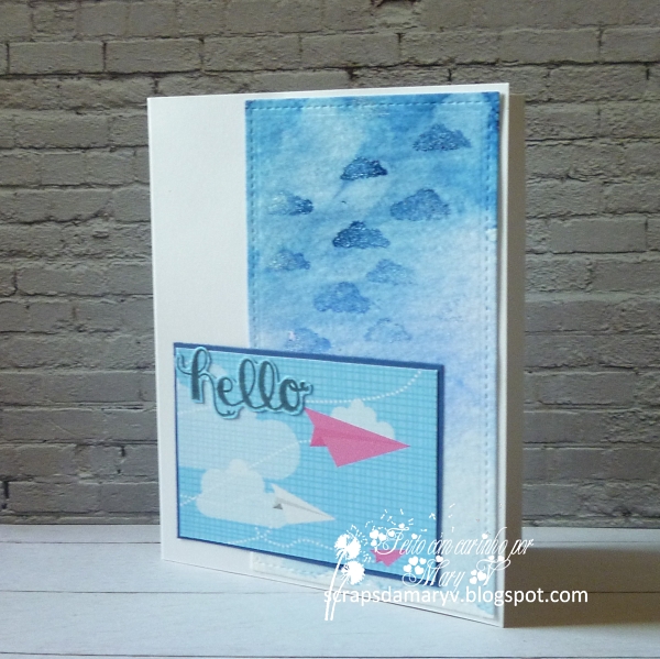 neste video. Em vez de folhagem, usei um cortante com nuvens e fiz o meu próprio carimbo. Não ficou tão bonito como o fundo da Jennifer, mas gostei de ter tido a oportunidade de fazer o meu próprio fundo, sem usar papel decorativo. Esse foi apenas usado para a cena com os aviões de papel que se vê no canto inferior direito do postal. Para a mensagem, usei um carimbo, que estampei em papel igual ao usado no pequeno retângulo e recortei-o.