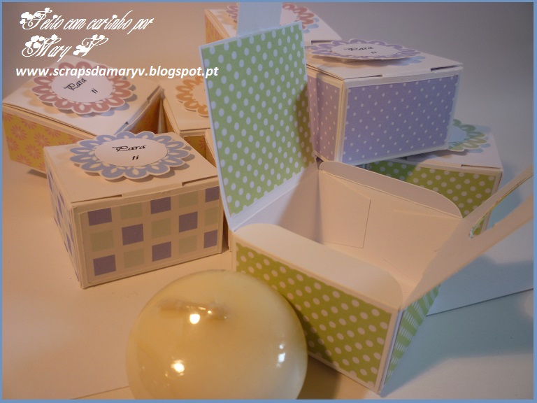 Hoje mostro-lhes umas caixinhas para velas flutuantes. As velas estavam cá em casa já há algum tempo e as caixinhas surgiram como ideia para uma pequena oferta. Claro que em vez de velas podem ser usadas para sabonetes. Espero que gostem.